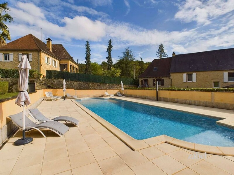 Located in the heart of the UNESCO World Heritage Site of Sarlat-el-Caneda, this building ensemble has a total of 12 bedrooms, a large swimming pool and a historic cave. Ideal for a family with great potential, due to its great location, for a gite/rental business (subject to the necessary permits). The main house consists of three floors. On the ground floor: kitchen with access to the rear garden, hallway, access to a large attic, office with access to the rear garden, toilet, family bathroom, master bedroom with en-suite bathroom and views of the impressive grotto with its prehistoric drawing. South facing, two further bedrooms, living/dining room with fireplace, connected to an enclosed terrace/balcony with views of the pool, gardens and cliffs. The attic has a high ceiling and is in excellent condition with beautiful exposed oak beams. It is just waiting for a complete renovation. On the garden level: a large garage, a cave, a boiler room and a laundry room. A cozy apartment with one bedroom, bathroom and dining room with private terrace with barbecue area completes the main house. A second stone family house, partially renovated, has a renovated apartment with a large bedroom on the mezzanine, a cozy dining room and a kitchen on the ground floor. In the rear garden there is a private seating area with access to the pool. The other part of the house is in need of renovation. On the 2nd floor there are two bathrooms and a dressing room, on the 1st floor two bedrooms and a bathroom, an entrance hall, a kitchen, a living room and a dining room, connected to the private garden via a beautiful winter garden. A special water system, a laundry room and a boiler room are located on the ground floor. As a special bonus, the ensemble offers three semi-detached houses on the ground floor, each with living/dining room, kitchen, bathroom, toilet, bedroom and rear terrace with direct access to the pool. The property has 4 covered garages at the rear with concrete floors and a large water reservoir underneath. Private parking spaces at the rear of the main house and also in front of each apartment. The swimming pool, 13x5m, is surrounded by greenery and its own cliff. Just a few steps from restaurants, shops and schools, makes this property a rare find!Excellent location in the heart of Sarlat Ideal for families and possible businesses Partially double glazed garages for houses and apartments.