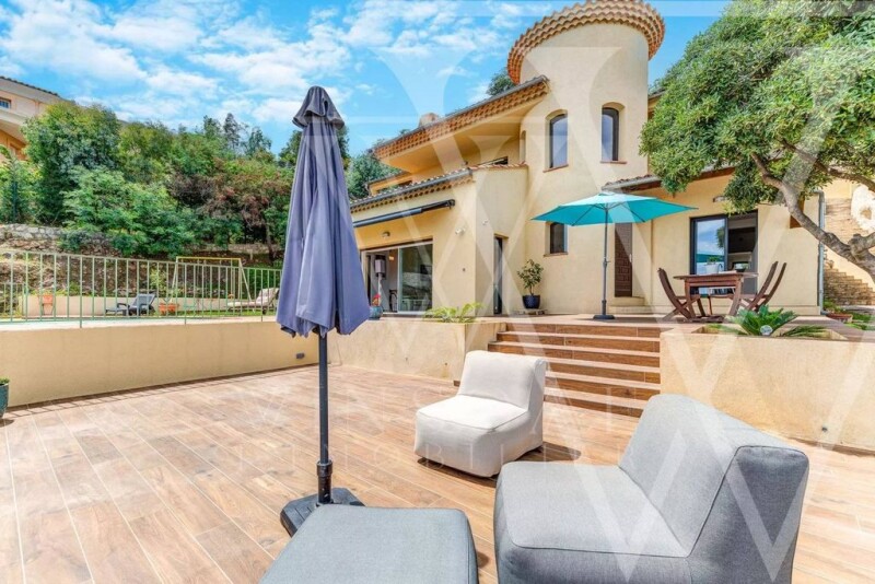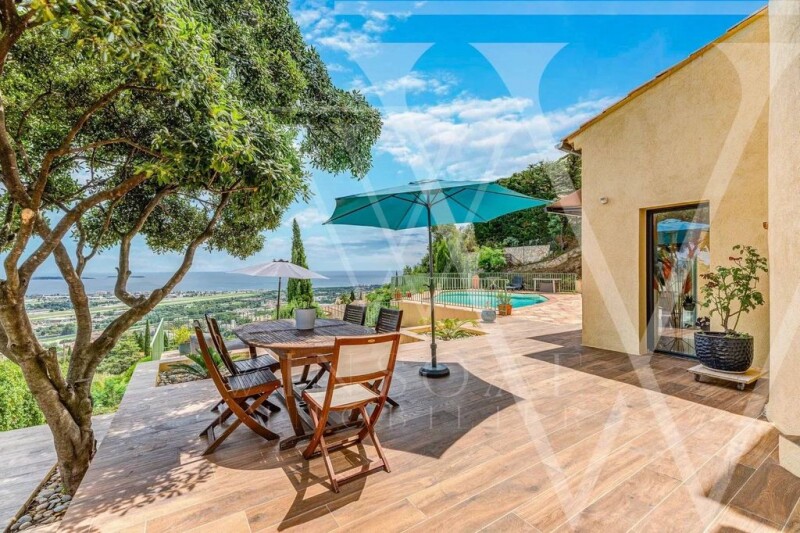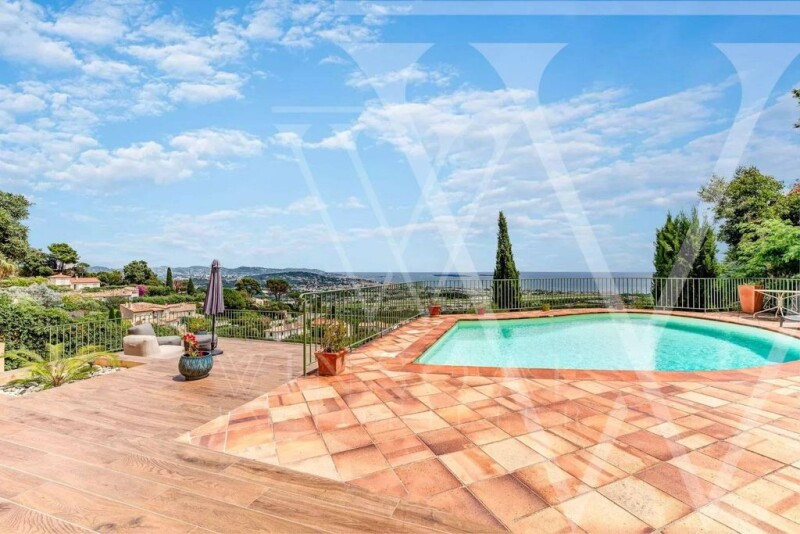 Ideally perched in a dominant position on the hills of Mandelieu, this sumptuous fully renovated villa offers a unique living environment with breathtaking sea views. Upon arrival, a parking area leads to a triple garage of 50m², a workshop, and a cellar, with the possibility of installing an elevator for ultimate comfort. Stepping inside, a spacious, light-filled living room welcomes a study area and a cozy reading nook around an elegant fireplace. The fully equipped kitchen, accompanied by a pantry and laundry room, opens onto a vast terrace where the pool blends seamlessly into the azure panorama. Upstairs, four en-suite bedrooms each benefit from their own private terrace, offering privileged moments facing the horizon. A haven of serenity, just minutes from amenities and the coastline. Information on the risks to which this property is exposed is available on the Géorisques website: georisques.gouv.fr.