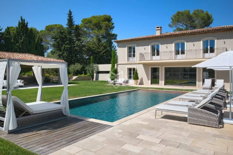 Sole agent : The Magrey & Sons group is pleased to present for sale a splendid property of approx 480 sqm in the heart of a magnificent flat landscaped garden overlooking one of the most popular hills of Mougins near golf courses, international schools and of the fine sand beaches of Cannes. Nestled in absolute calm, this sumptuous recently designed bastide (still under ten-year warranty) will immerse you in the heart of our charming Provence with its architecture combining noble stones, solid parquet, large volumes and large openings letting in light. The charm of the interiors is enhanced by a splendid garden of 3,300 sqm in the colors of the South between olive trees, lavender and cypresses allowing you to enjoy the heated swimming pool and the pool house around a barbecue with friends in an idyllic setting. This favorite property with 5 en-suite bedrooms is very pleasant to live in since it offers a vast space on one level as well as a peaceful living environment thanks to its fluid distribution, its large spaces inspiring freedom and conviviality, as well as its services since you will find a games room, a real cinema room, a very efficient home automation system, a heated swimming pool, a summer kitchen, a perimeter alarm, a double closed garage as well as a large car park. État des risques et pollution: réalisé (2023-06-28).