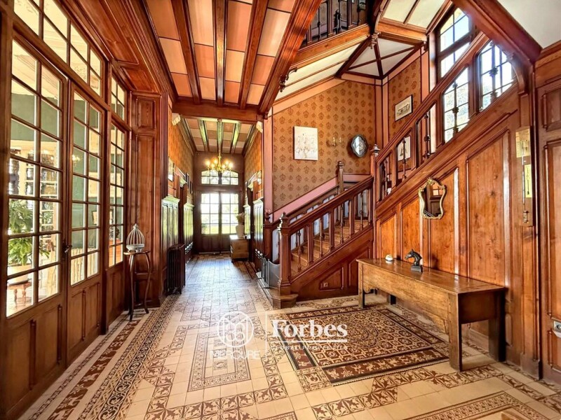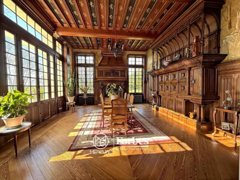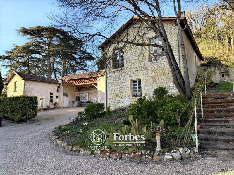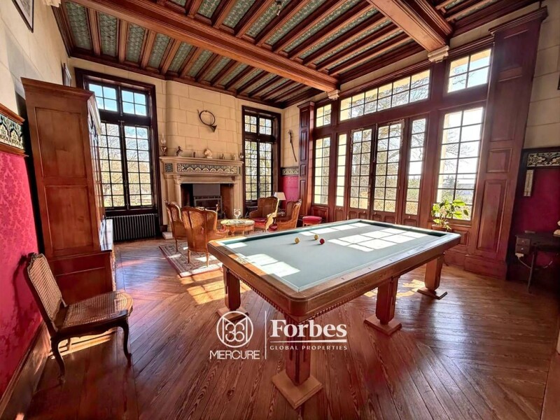 Built in the heart of a magnificent landscaped park that extends into the forest and also includes meadows, this 19th-century château with 470 sq.mt. of living space is distinguished by a series of reception rooms of over 100 sq.mt. adorned with numerous remarkable architectural features. Located on the edge of a wine-growing region, the estate offers vast outbuildings that extend into impressive vaulted cellars housing an old wine press and a working bread oven. It also includes beautiful recent equestrian facilities, including a large stable with ten boxes. At the entrance to the property, a caretaker's house awaiting renovation completes the ensemble. The château comprises a large entrance hall with cement tiles and a superb staircase on the ground floor, a suite of three reception rooms spanning 103 sq.mt. with herringbone parquet flooring, a stone fireplace, a carved wood fireplace, restored wall paintings, and ornate ceilings, a recently renovated kitchen with a dining area, an office with an ornate fireplace, a guest toilet, and a shower room. Upstairs, a pleasant landing leads to four bedrooms with parquet floors and fireplaces, a dressing room, a new shower room, a guest toilet, and a laundry room. On the second floor, there are four bedrooms with parquet floors and marble fireplaces, an office, two shower rooms, and a guest toilet. The outbuildings consist of an old tower, a barn, a U-shaped building including a workshop, sheds, saddlery, bakehouse, old dwellings and stables... backed by troglodyte cellars with stone-clad ceilings. A house with an adjoining covered courtyard located next to the entrance gate is in need of renovation. Selling price : 1,500,000 euros. Fees at seller's expense. Energy class : D. Climate class : B. Estimated annual energy costs for standard use : between 5,960 and 8,150 euros per year. Prices indexed to 1st of January 2021. Information on the risks to which this property is exposed is available on the Georisques website : www.georisques.gouv.fr.