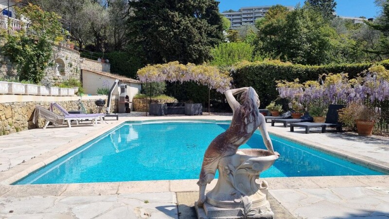 In a residential area of “Le Cannet”, this former residence of a Russian Count is located in a private park of approx. 3000 m2. planted with century olive trees, fruit trees and a flowered garden surrounding a magnificent mosaic swimming pool. The living area, with a surface of 530 m2, comprises large reception rooms, a large fitted kitchen with central island, 6 bedrooms, an independent studio flat and also two guest houses that can welcome up to 15/20 persons in bedding situation and in total comfort! Part of the plot can accommodate a building of approx. 250 m2, and can be sold separately. Contact us today to find out more.