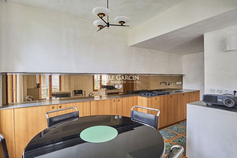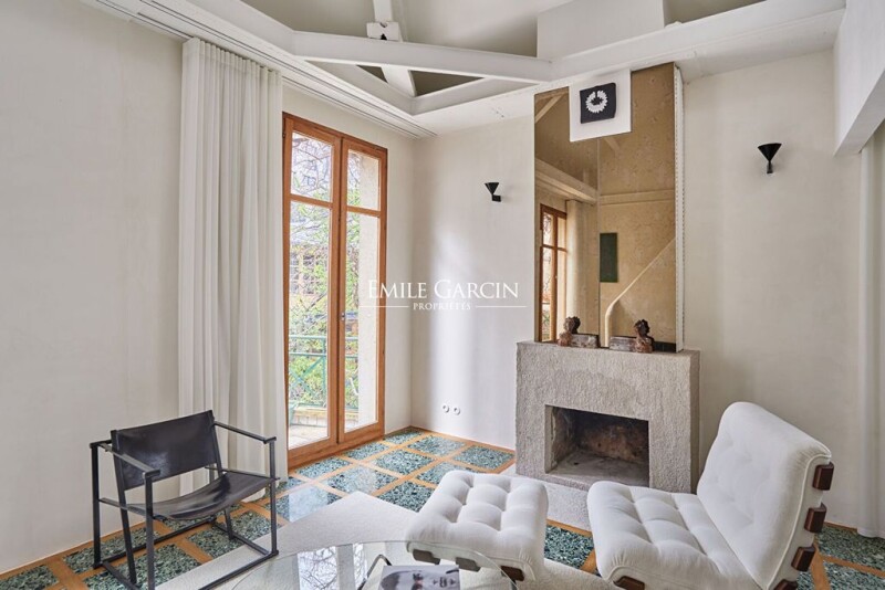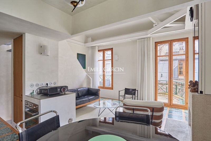 Rare, very sought-after and hidden place, in a quiet area, this former large printing works rehabilitated into a few houses nestled in a planted garden is unique. This house renovated by architects with the designer charm of a small countryside in Paris, of approximately 60sqm on two levels including an entrance, a suite with its shower room with toilet, a laundry closet, a guest toilet, the whole overlooking a small garden of 18sqm sheltered from view. Accessible by a comfortable staircase, upstairs, a fitted kitchen opening onto a cathedral living/dining room with a fireplace and access to a private terrace of 12.5sqm facing west and on the mezzanine, a bedroom or office overlooking the living room. Potential for expansion upstairs subject to administrative authorizations.