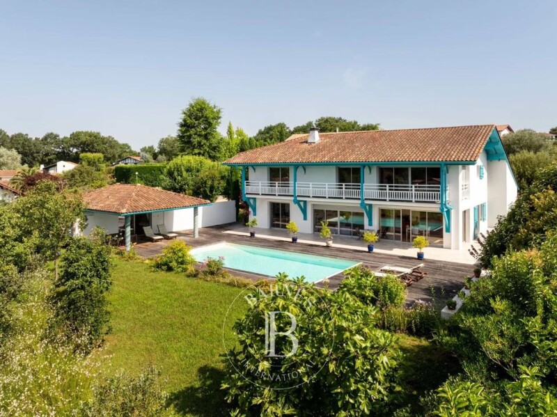 Ideally located in Arbonne, 3 minutes walk from the village center, house of approximately 270 m² offering a beautiful unobstructed view of the mountains. The house includes a large living room opening onto the terrace and the swimming pool and 6 bedrooms including a large master suite. Heated swimming pool and pool house. Double garage. État des risques et pollution: en cours (null).