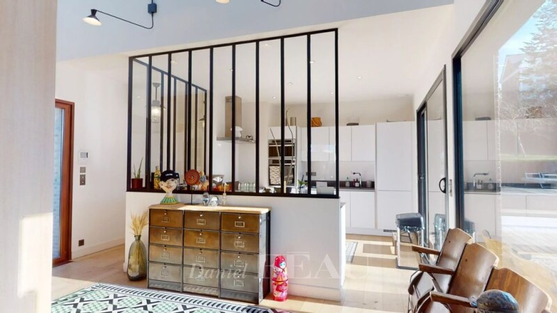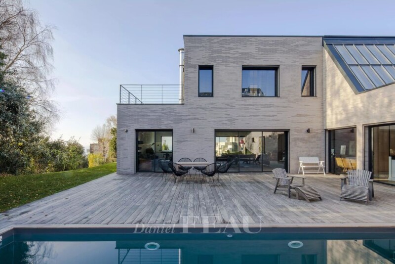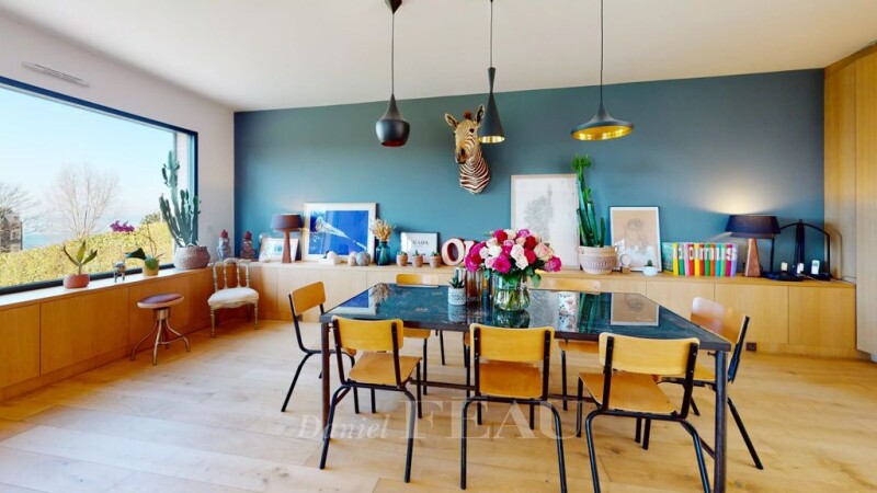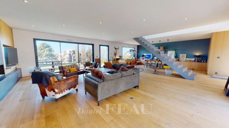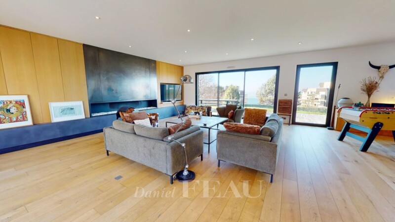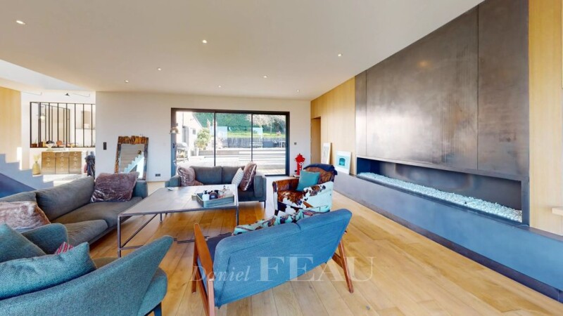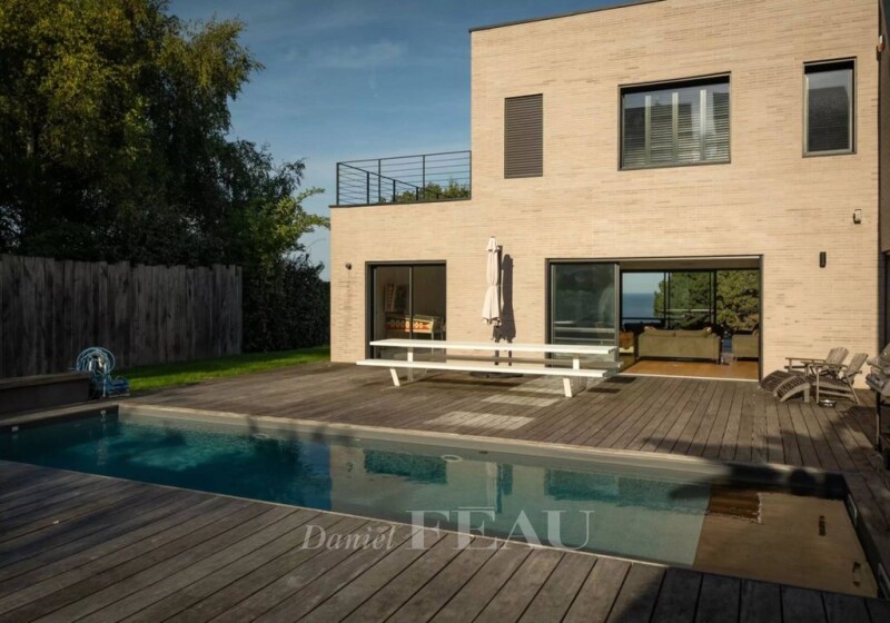 In Normandy, in the Calvados region, in the commune of Trouville-sur-Mer, Daniel Feau Deauville presents you with a magnificent contemporary house built in 2016, benefiting from a superb open sea view. Built on a plot of land of about 2000 m2, the villa offering about 260 m2 of living space is arranged as follows: an entrance hall with glass roof, a magnificent reception room of about 95 m2, gas fireplace and double exposure, an open plan fitted and equipped kitchen, a guest toilet, two bedrooms on the same level, a shower room, a cellar and a garage. On the first floor, a superb master suite with sea view, dressing room, complete bathroom and terrace, a bedroom with shower room and toilet. At the back of the house, a beautiful relaxation area with heated and secured swimming pool and south facing terrace.