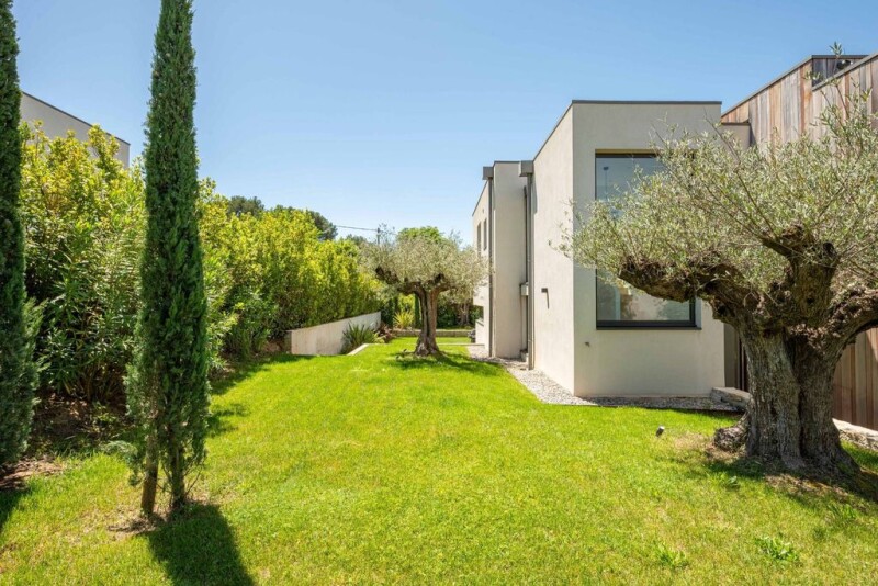 Exclusive, Aix, 3km from the Luynes sector center, HOUSE 260M2 - GARAGE 32M2 - SECURE HEATED SWIMMING POOL - LAND 1032M2 - 5 BEDROOMS -, Chemin Des Frères Gris, quiet, Recent contemporary house 5 (2021) of 260 m² Plus a double garage, on enclosed land of 1000 m² with heated swimming pool, secure. This villa offers optimal light with its very large openings and its panoramic bay windows in the large 80 m² living room with American kitchen opening onto the terrace and the landscaped garden with century-old olive trees. Upstairs is an office, three large bedrooms and two bathrooms, 2 toilets. It also offers a bedroom with its bathroom, separate toilet and a games room TV lounge guest bedroom. The house is connected to fiber, Heating is in reversible air conditioning, Ducted, DPE A. The house is connected to mains sewerage. The technical file includes work damage, compliance, an electric charging station and storage. 2 gates, parking for 3 cars, buses and shops on foot. A unique turnkey product. House designed by a recognized Aix architect.