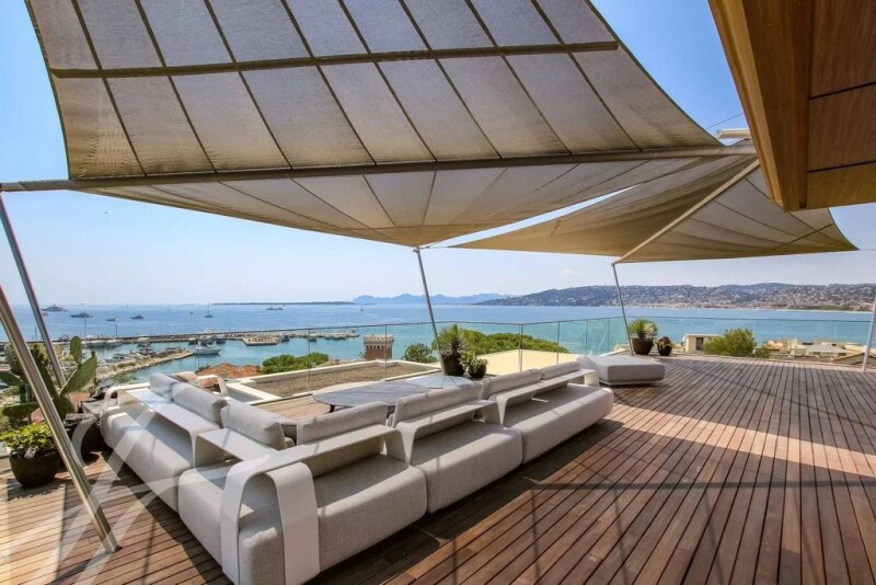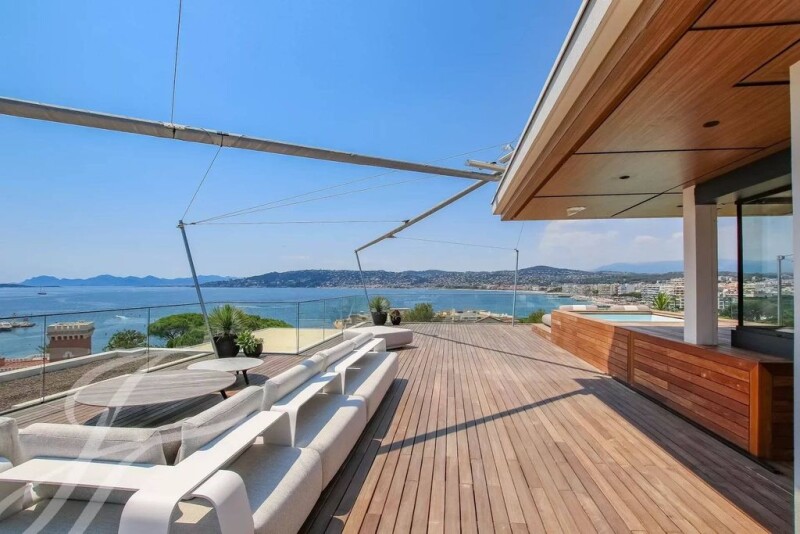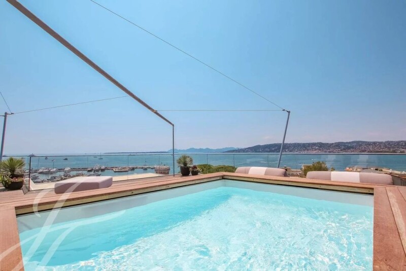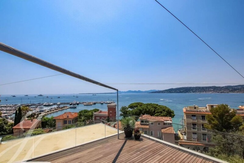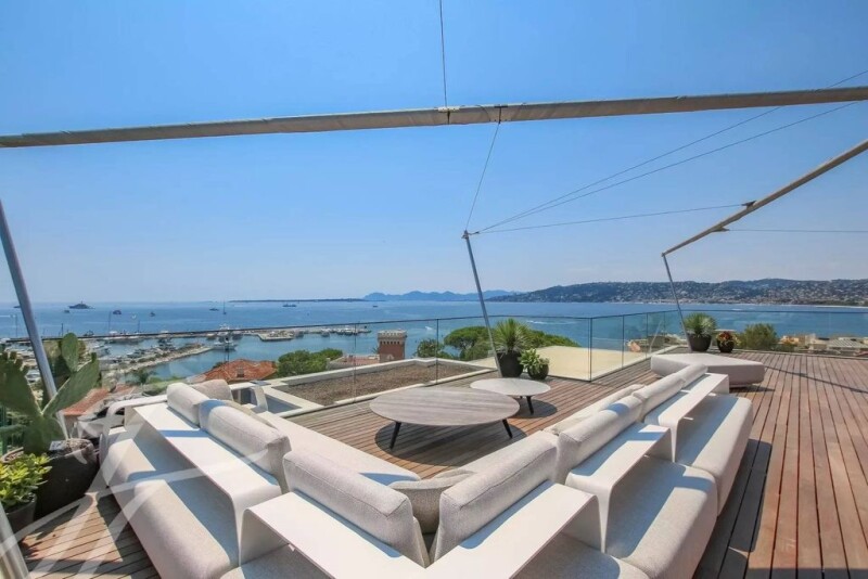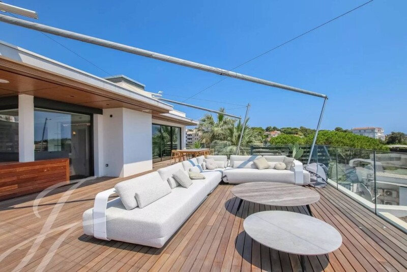 In a new-build development to be completed in 2021, "Villa Chêne Roc", on the western slope of Cap d'Antibes, within walking distance of beaches and shops. Exceptional rooftop villa offering 140 sm of living space, with an exceptional 135 sqm terrace featuring a swimming pool and outdoor lounge, and panoramic views of Cap d'Antibes, the Bay of Juan les Pins and the Lérins Islands. Description : Duplex, comprising : Entrance hall, three bedrooms and 3 shower rooms opening onto terraces. Access to upper level via staircase and private elevator, double living room, open-plan kitchen (BOFFI) and WC. Garage for 4 cars and cellar.