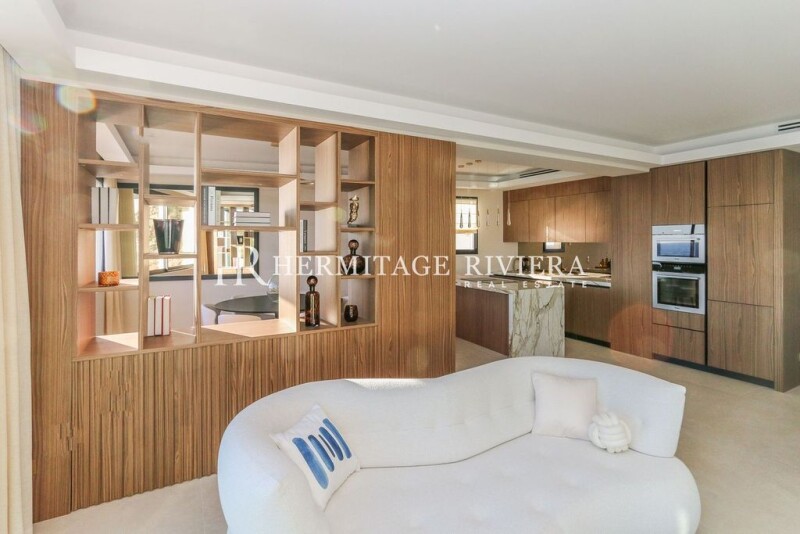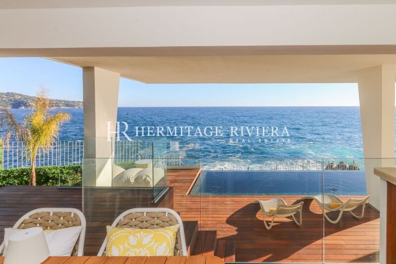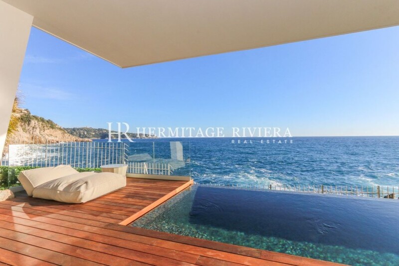 Exceptional contemporary waterfront villa recently renovated, located in a private estate with direct access to seafront. Offering an exceptional breathtaking panoramic view along the coast to Cap Ferrat. The property is arranged over 2 levels, and is comprised on the upper level of an entrance hall, a spacious living room, dining room with open-plan kitchen, guest toilet and a bedroom with wardrobes and bathroom, gym and sauna. On the lower level there are three bedrooms, of which the principal bedroom suite with open-plan bathroom and access to a private balcony hanging over the sea. Two further bedrooms both with wardrobes and bathrooms, dressing and laundry. On the level with the sea, a stunning infinity pool just meters from the sea, and large terraces around with a summer kitchen. Access direct to a waterfront pathway allows you to go on foot to Nice and Villefranche along the sea. Parking for three vehicles.