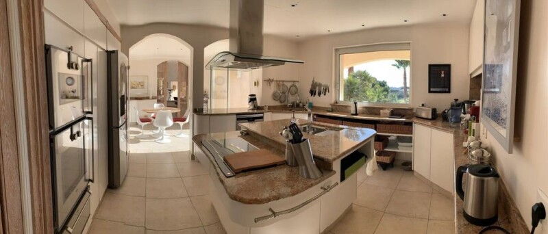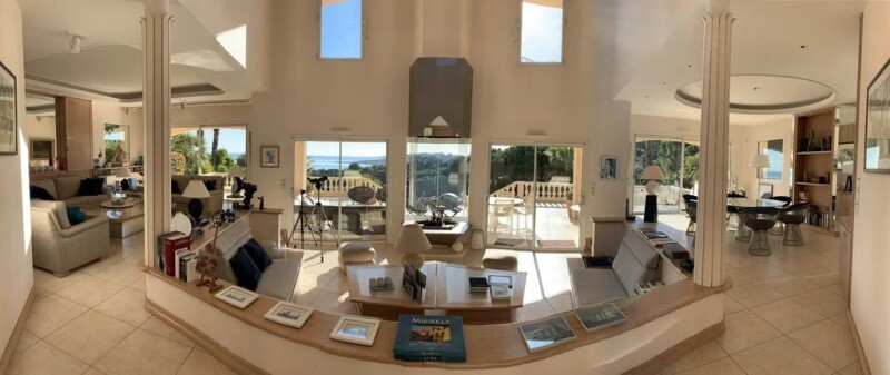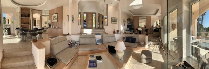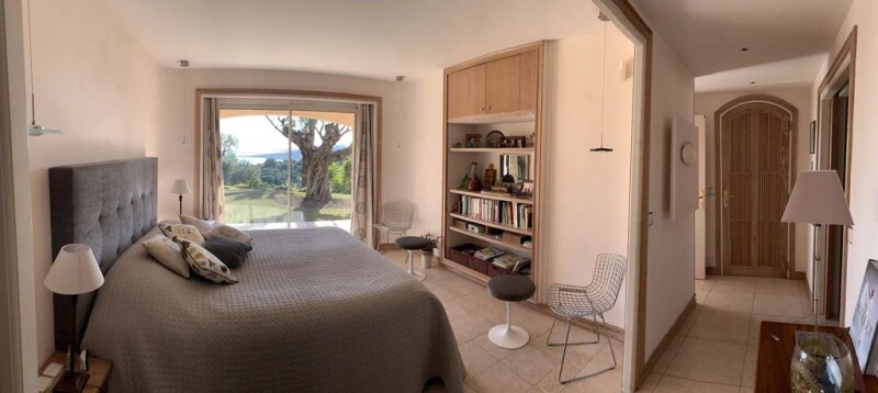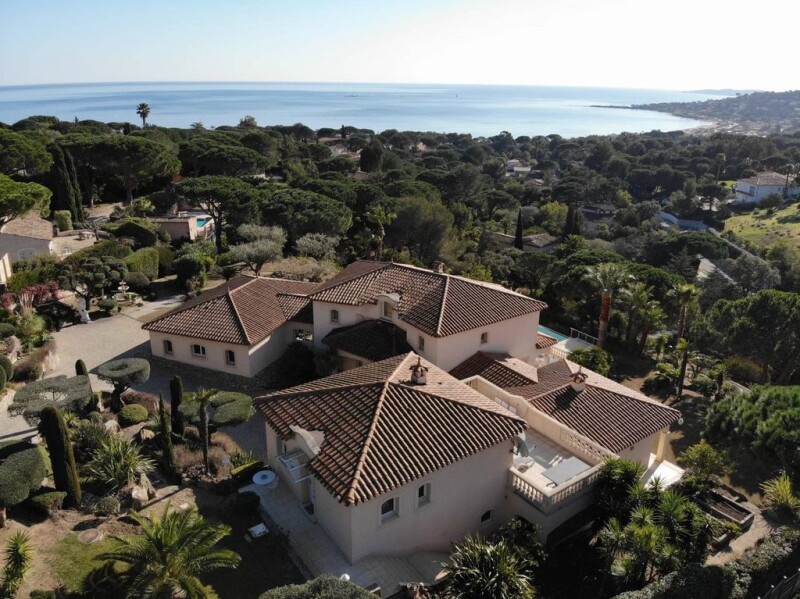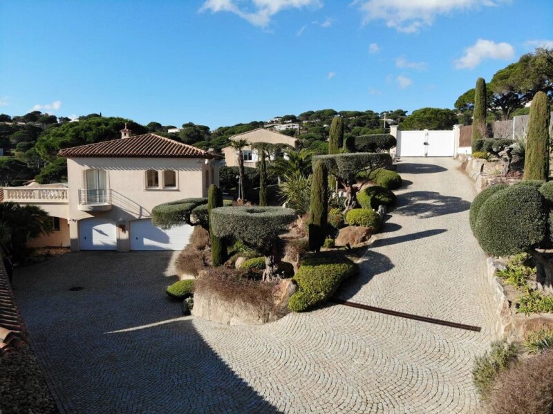 Exclusive: located near the town center of Sainte-Maxime, 600 m from the beach, this very beautiful architect-designed villa of 300 m², facing south, secure, not overlooked, with its infinity pool, positioned on a a plot of 3700 m² with trees, also benefits from a magnificent landscaped garden and a breathtaking view of the sea. The property consists of a main house, a guest apartment as well as annexes including a garage that can accommodate three cars, a wine cellar, a workshop and adjoining sanitary facilities. The living areas are very well designed with views of the sea and the landscaped garden from all living areas of the house. The ground floor is made up of a beautiful entrance hall opening onto a large cathedral living room, a dining room with large bay windows extending a majestic glass fireplace facing the sea. A beautiful kitchen, on the south-west side of the house, with high-end appliances, is accompanied by a dining area, a laundry room and a storeroom. On the South East side, the Master bedroom has a bathroom and two dressing rooms, one on each side of the bathroom. In its extension there is a music room, an office and a library. all the woodwork is made to measure, in ceruse wood, giving a warm and relaxing atmosphere. Outside, the living room extends onto a large 200 m² terrace offering an exceptional panoramic view of the sea, then we head towards the infinity pool surrounded by a 118 m² terrace. Upstairs there are two bedrooms with bathroom, WC and shower room. They open onto a terrace with stunning sea views. Many amenities: Central vacuum, generator, well... État des risques et pollution: en cours (null).