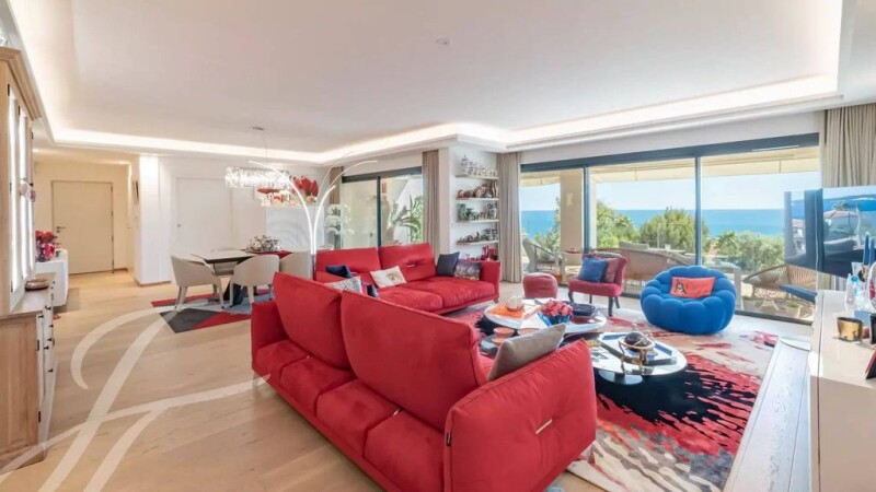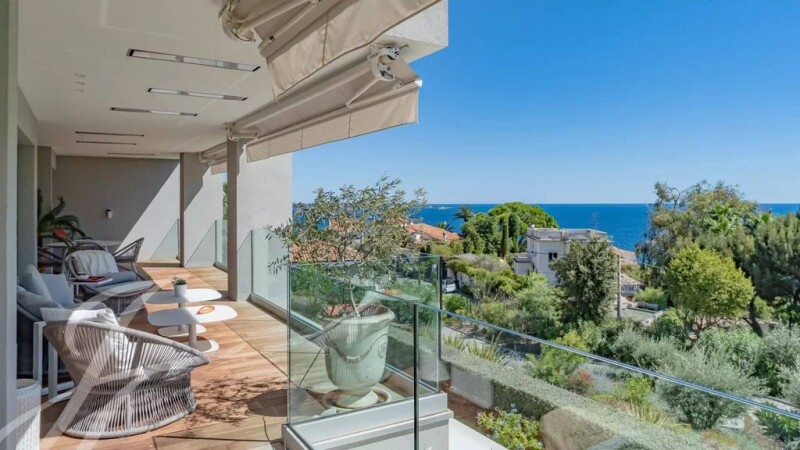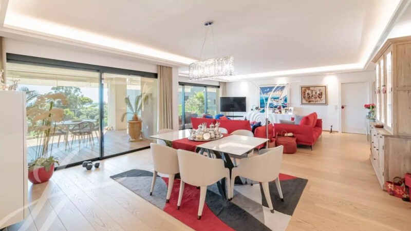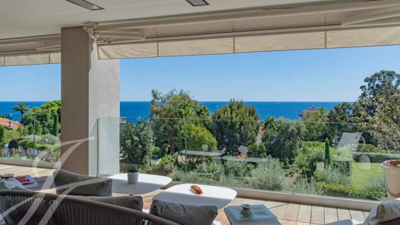In a recent residence with swimming pool, gym and 24/7 janitor, this beautiful apartment in perfect condition offers a large terrace and a beautiful view of the sea and Cap d'Antibes. With a surface area of approx. 170 m², it comprises an entrance hall, guest toilet, office that can be converted into a bedroom, spacious living room, fully-equipped independent kitchen with laundry room, and two en suite bedrooms with dressing rooms and shower rooms. A double garage and cellar complete the ensemble.