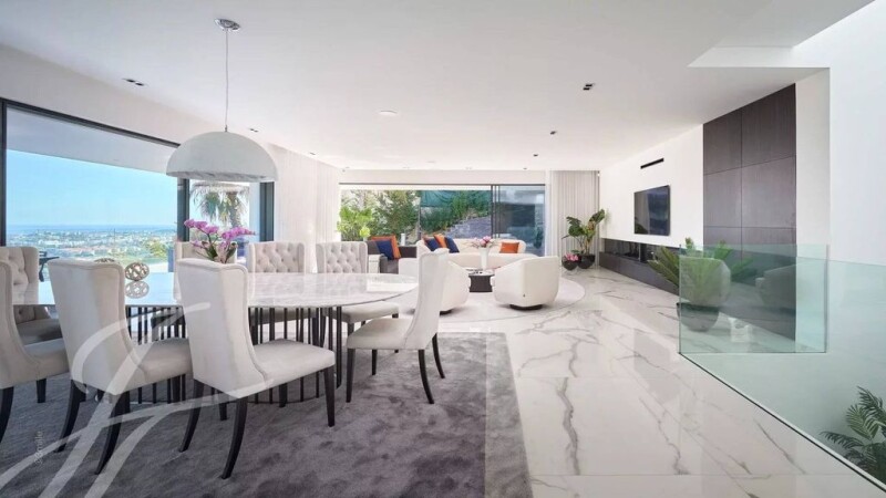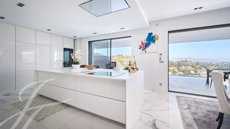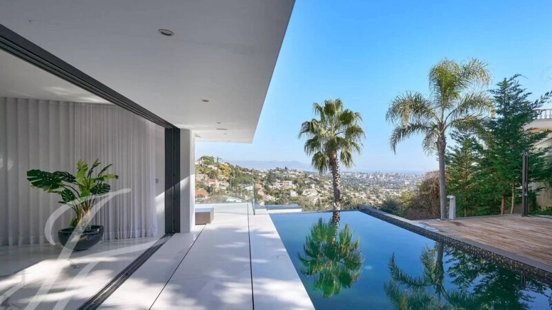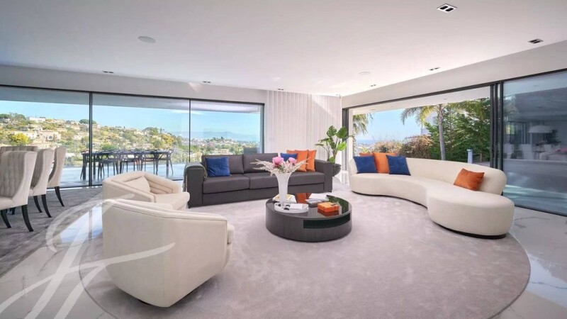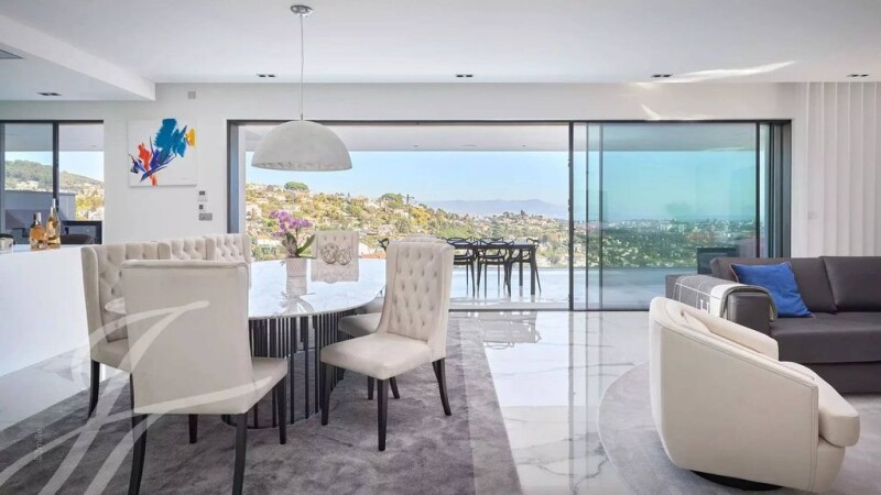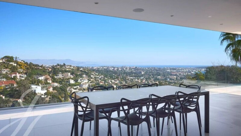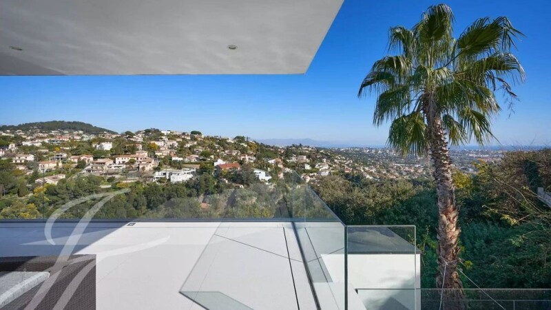 Situated in a dominant position, this superb new villa with luxurious finishes offers a panoramic view over the coastline, Cap d'Antibes and mountainous terrain. Built on two levels, with lift, the villa boasts 330 sq.m in perfect harmony with the outside environment. The volumes and the open-plan living rooms give an incredible feeling of space. The floor-to-ceiling bay window make the main level a sublime reception area flooded with natural light and breathtaking views. A long pool, out of sight, completes this floor. On the lower level there is an elegant master suite with its bathroom opened to the bedroom and 3 en-suite bedrooms with toilet, shower and/or bath. This gorgeous contemporary villa has been finished to the highest standard.