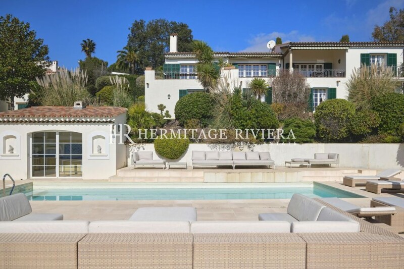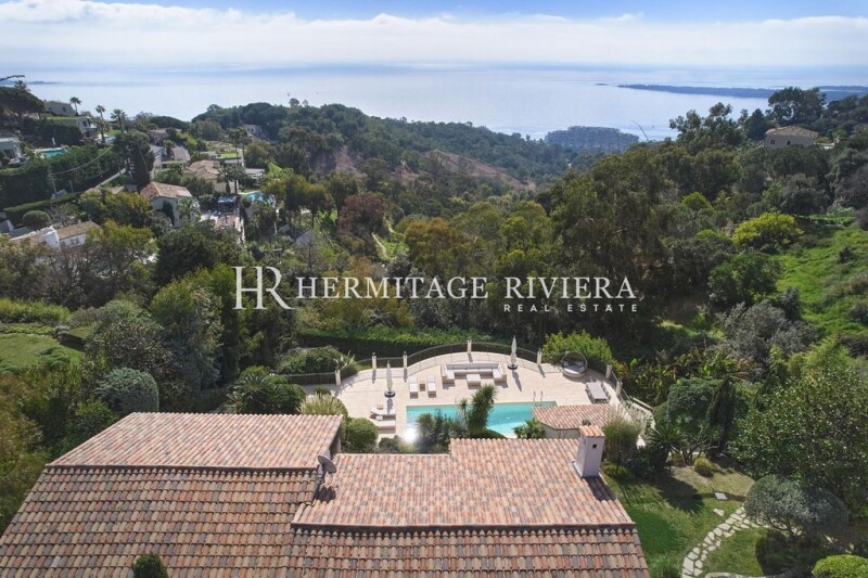 Splendid property in absolute calm with a south exposition offering a panoramic view of the sea located in the sought after Super Cannes a just few minutes’ drive from the center of Cannes and the Croisette. The main house is arranged over two levels with internal lift, it is composed of an entrance hall, a double reception room open onto the terrace, a living room with fireplace, a dining room, family kitchen, laundry room and a dressing room. On the garden level are four bedrooms all with bathrooms and dressing. An independent house for personnel with living room, kitchen, two bedrooms and a shower room. In the garden a swimming pool, pool house and summer kitchen. Double garage, parking for many vehicles.
