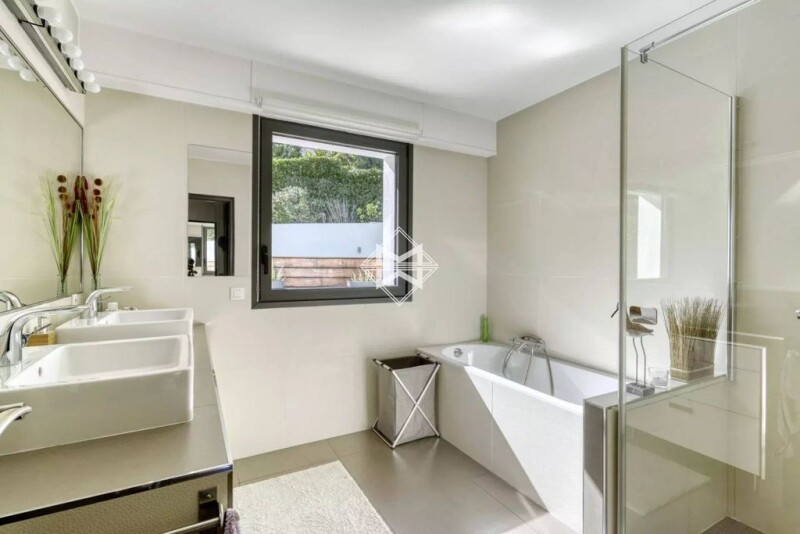 Just 10 minutes walk from the beach, contemporary villa with panoramic sea view in the heart of a quiet and sought-after private estate. This turnkey villa with an area of approximately 220 m2 develops bright and pleasant volumes distributed as follows: The ground floor offers a living room opening onto the garden with sea view, a fitted kitchen, as well as 3 bedrooms including 1 en suite. Possibility of enjoying independent access. The first floor has a large and bright living room with fireplace, an American kitchen, as well as 2 bedrooms including 1 master bedroom with bathtub, shower and dressing room. The whole benefits from beautiful secure terraces with breathtaking sea views. The villa is built on a plot of 1175m2 with a friendly swimming pool in the heart of a delicately landscaped garden. Air conditioning, parking spaces, automatic watering, outdoor lighting, electric gate, mains drainage. Magnificent sea view and ideal location with the beach on foot and in the heart of a quiet estate.