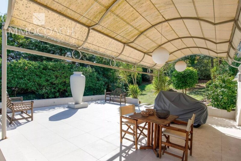 Close to CANNES and directly bordering the town of MOUGINS. Magnificent property in a dominant position with a sea view, located in a privileged and residential area close to all amenities. The fully renovated villa, with high-end features and high-quality materials, offers approximately 300 square meters of living space on a flat, landscaped 2,500 square meter plot with flowerbeds, shrubs, and trees, situated in a charming environment. On one side, there is a superb swimming pool adorned with small mosaics, a 110-square-meter pool house with a fully equipped summer kitchen, and a living/dining room opening onto the terrace and the garden, creating a natural oasis. On the other side, there is a 60-square-meter summer terrace, partly sheltered, with a cozy area in a garden with large trees. The villa (constructed on a crawl space) is composed as follows: On the ground floor: 4 bedrooms with balconies, garden view, 3 shower rooms, 3 bathrooms, 3 toilets, a laundry room, and numerous closets. Upstairs, where all rooms open onto a sea view terrace, you will find a spacious and bright living area with a dining room and a fully equipped kitchen. On one side, there's a living room with a fireplace, and on the other side, the "MASTER BEDROOM" with a sea view and an en-suite bathroom. Additionally, there is a fitness room and/or an office in the annex, a "Double CARPARKK CAUCHY" with an electric car charging point, a cellar, and a garden shed. A large and beautiful "family home" full of charm and authenticity in a natural setting. Agency fees of 6% including tax are the responsibility of the buyer and included in the displayed price. Information about the risks to which this property is exposed is available on the Georisques website: georisques.gouv.fr.