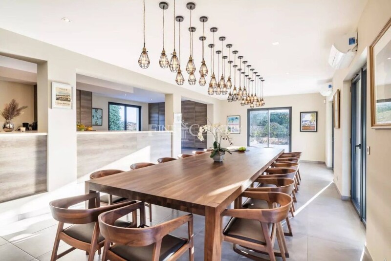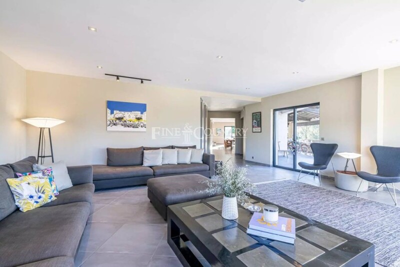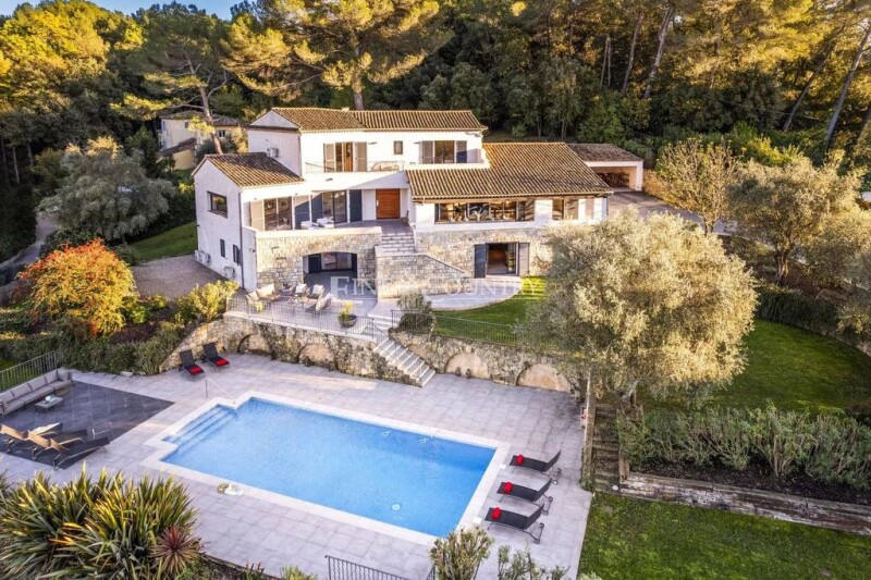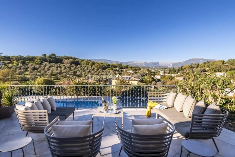 Modern Villa with Exceptional Walkability to the Charming Village of Valbonne, Nestled in the Heart of the French Riviera's Countryside This beautifully contemporary provençale villa is ideally located just a 15-minute walk from the picturesque village of Valbonne, with its cobbled streets, vibrant cafés, and authentic Provençal charm. Set near the renowned towns of Mougins and Antibes, the property offers a perfect blend of contemporary luxury and traditional Mediterranean appeal, making it an ideal primary or secondary residence in one of the most sought-after areas of the French Riviera. Spanning across a generous living space, the villa boasts six well-appointed bedrooms, five stylish bathrooms, and a fully equipped, modern kitchen. The open-plan design emphasizes a seamless flow between the spacious living room, dining area, and the kitchen, creating an ideal space for family living and entertaining. Large French doors open to the main terrace, which overlooks the inviting pool and manicured gardens. A long wooden dining table on the terrace comfortably seats up to sixteen guests, offering an exceptional setting for al fresco dining and enjoying the views of the surrounding hills. The beautifully landscaped gardens feature terraced areas that are perfect for relaxation or enjoying the serene views of the countryside. A barbecue and bar-style seating area provide the perfect spot for casual meals outdoors. The tranquil setting, combined with panoramic views, creates an extraordinary private oasis. The villa is bathed in natural light, with spacious interiors that are tastefully decorated in a contemporary style, featuring elegant furnishings and high-end finishes. The top floor offers three luxurious bedrooms, each with its own en-suite bathroom. The main living areas—living room, dining room, and kitchen—are located on the ground floor, which also includes three additional bedrooms, a cozy TV room, a games room with a ping-pong table, and a wine cellar. The property is fully air-conditioned, except for the home cinema and games room, which remain naturally cool. The outdoor spaces are a true highlight of this villa. Relax by the pool with a chilled glass of rosé, dine alfresco surrounded by olive orchards, or take a leisurely stroll into the village to enjoy its cafés, boutiques, and the local atmosphere. This villa offers the ultimate family getaway, with easy access to all the amenities and charm that Valbonne has to offer, while maintaining a sense of privacy and tranquility. With its close proximity to the village, stunning countryside views, and impeccable design, this villa is a rare gem in the French Riviera's backcountry—an ideal home for those seeking a sophisticated yet relaxed lifestyle.