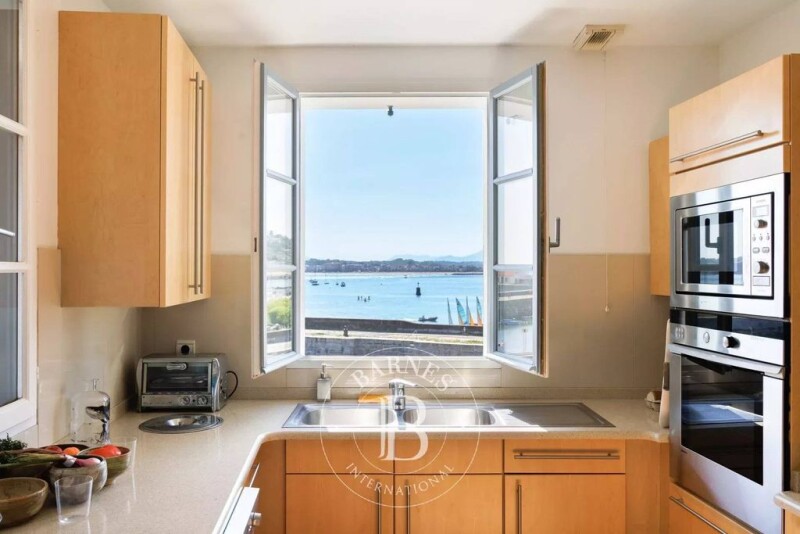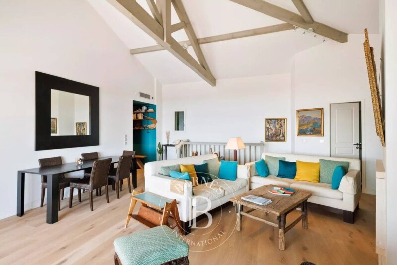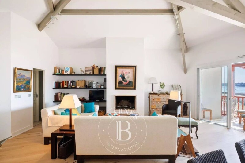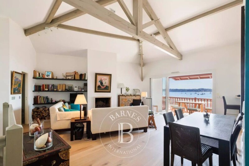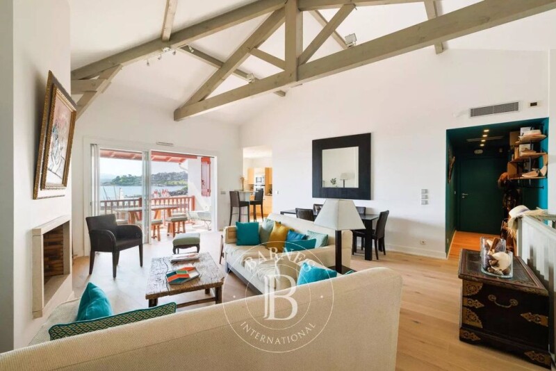 Ideally located on the top floor of a luxury residence with elevator, superb duplex of approximately 113 m² with breathtaking views of the Bay, the Rhune and the port of Socoa. This apartment consists of an entrance, a cathedral living room with fireplace opening onto a terrace with open views, a kitchen, a master suite with shower room, two bedrooms, a bathroom and a laundry room. This apartment entirely facing the Bay has air conditioning. A large garage completes this exceptional property as well as a cellar.