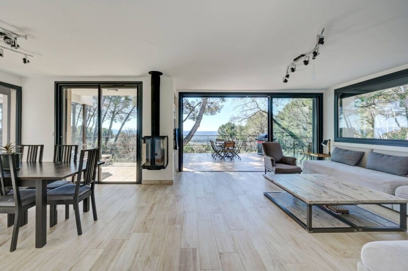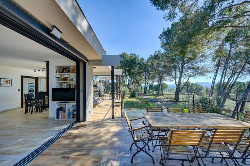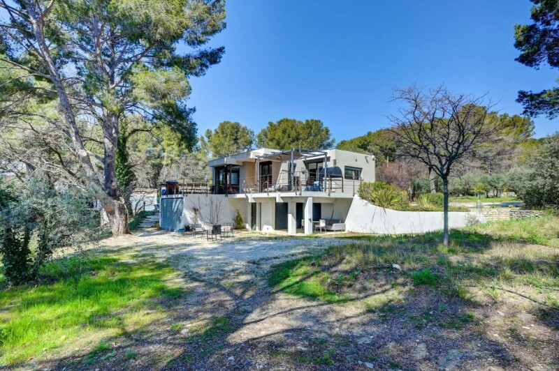 AIX NORD EGUILLES, QUIET, EXCEPTIONAL VIEW, modernist villa of 190 m² on a fully fenced plot of over 8000 m², in a dominant position and offering a panoramic view of Aix. The property includes beautiful spaces, a living room/dining room with an equipped open-plan kitchen area. It includes a T5 (main house) and a T3 rented from September to June. A magnificent wooded park of 8560 m², offering peace and serenity. In Annex: A space of 71 m² that can be used as a reception room or gym. Swimming pool: 10 x 5 m for moments of relaxation. Pétanque court: for outdoor recreation enthusiasts. Garage and Parking: 1 garage and numerous outdoor parking spaces. Water from the Canal de Provence, fiber optics, automatic gate. The property is connected to the sewer system for optimal comfort. TECHNAL joinery Electric roller shutters with remote control Underfloor heating and cooling Wood stove DPE.