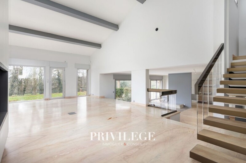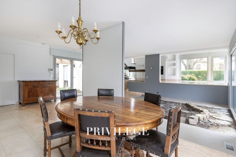 800m from the centre of Ecully, in a park of almost 10,000m2, come and discover this house of approximately 220m2 of living space and numerous additional areas, with swimming pool, built on a full basement. Mainly built on one level, this house is very pleasant to live in with its generous volumes and bathed in light thanks to the numerous south-facing openings. It benefits from a very large double living room with cathedral ceiling opening onto the dining area, a games room, a separate kitchen, a laundry room as well as 3 bedrooms (possibility of 4) on one level, 2 shower rooms and a suite on the 1st floor (bedroom + bathroom). This house from the 70s was built with quality materials and renovated over time (change of frames, bathroom, roof, heat pump?). The large basement consists of: a large garage, a boiler room (solar panel + PAC), a convertible room, cellar, storage space... The wooded park offers a beautiful space for relaxation and games and benefits from an old chapel. It is possible to carve out a building plot.