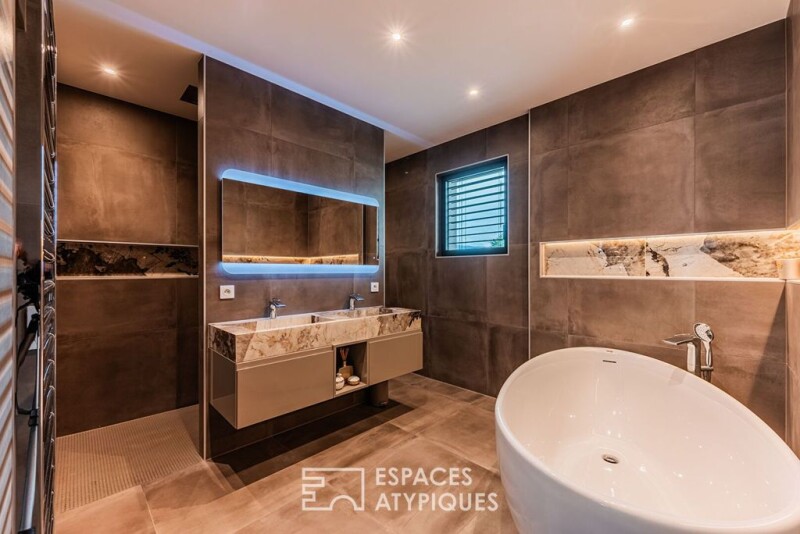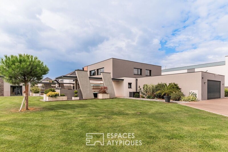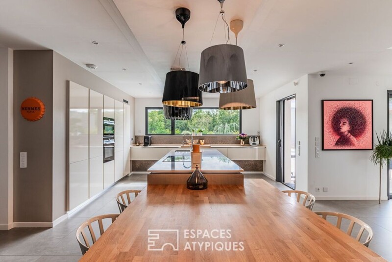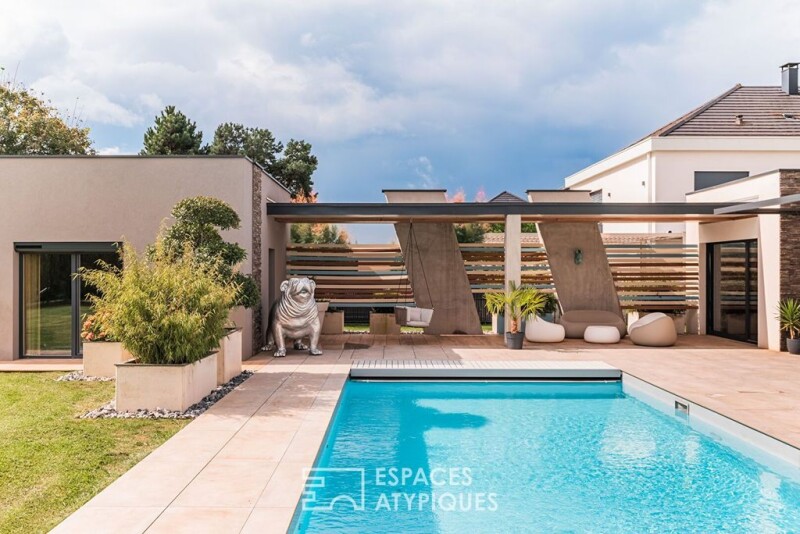 Nestling in the heart of the Potassic Basin, this modern architect-designed house, built in 2017, spans 330 m² of living space and 85 ares of grounds. Just 20 minutes from the centre of Mulhouse and close to the main roads, this property enjoys a peaceful, leafy setting. Swimming pool, terrace, wooded garden, triple garage and summer kitchen complete this exceptional property. The contemporary architecture of the house stands out from the moment you enter, with a vast hallway leading to a light-filled living room of over 70 m². The open-plan, fully-equipped kitchen opens onto a south-facing living room bathed in light thanks to a large picture window. Ceiling heights of over 7 metres and large-format tiling accentuate the feeling of space. A double-sided fireplace adds a cosy touch, ideal for winter evenings. The master suite, with its dressing room, bathroom and direct access to the garden, is a haven of peace. A study, shower room, storeroom and utility room complete the ground floor. An elegant solid oak staircase leads upstairs to the sleeping area. This comprises three bedrooms, two with dressing rooms, a bathroom and an additional dressing room. A large mezzanine overlooks the living area, adding an airy dimension to the whole. Outside, the perfectly landscaped garden features a 13x5 m swimming pool heated by a heat pump, surrounded by a terrace of almost 200 m². A pool house with sauna and jacuzzi extends the relaxation area. The summer kitchen, automatic watering system and 40 acres of fully fenced landscaped areas add to the property's practicality and aesthetic appeal. The peaceful setting, close to schools and shops, offers a high quality of life. A triple garage, an additional garage and a cellar complete the many assets of this property. With its clean lines and top-of-the-range comforts, this architect-designed house is a rare property that combines modernity, privacy and nature. A unique living environment that is sure to appeal to lovers of exceptional spaces. Shops 5 minutes' drive away Schools 5 minutes' drive away Railway station 5 minutes' drive away ENERGY CLASS: C / CLIMATE CLASS: C Estimated average annual energy costs for standard use, based on average energy prices indexed to 2021, 2022 and 2023 (including subscriptions): between euros1,760 and euros2,420. Contact: Marc 07.44.88.95.17.