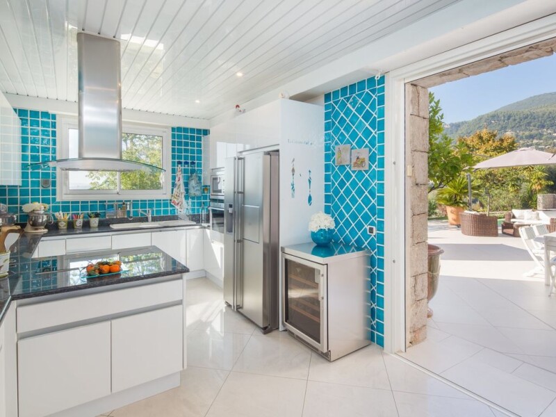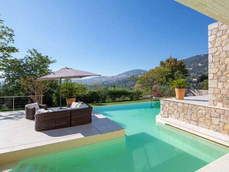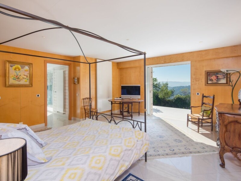 Nestled in the heart of the Grasse countryside, stunning property of contemporary style mixing harmoniously glass and wood to emphasize light and volumes. The ground level features a beautiful glass entrance hall, a high-ceilinged sitting room bathed in light, with fireplace, a dining room, an independent and ully-equipped kitchen, a study, large master bedroom suite with adjoining dressing room and bathroom, plus another bedroom suite. The upper level encompasses 2 very large bedroom suites - each opening out to a private terrace, as well as a mezzanine with library. All rooms on the ground floor are extended by a huge terrace and surround a beautiful swimming pool of generous proportions, heated and with overflow effect. The landscaped grounds of 11 500 sqm have been tastfully planted with olive trees and numerous fruit trees, enhanced by a lovely pond, a petanque pitch, an outbuilding plus a double garage. A real haven of peace where nature and open views prevail, only a quick drive to all facilities.