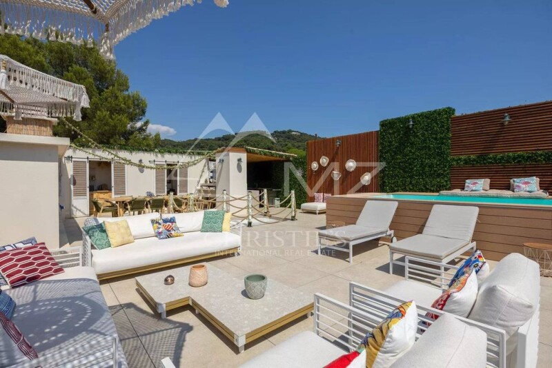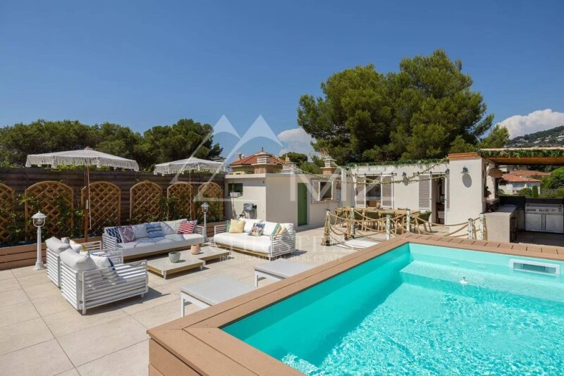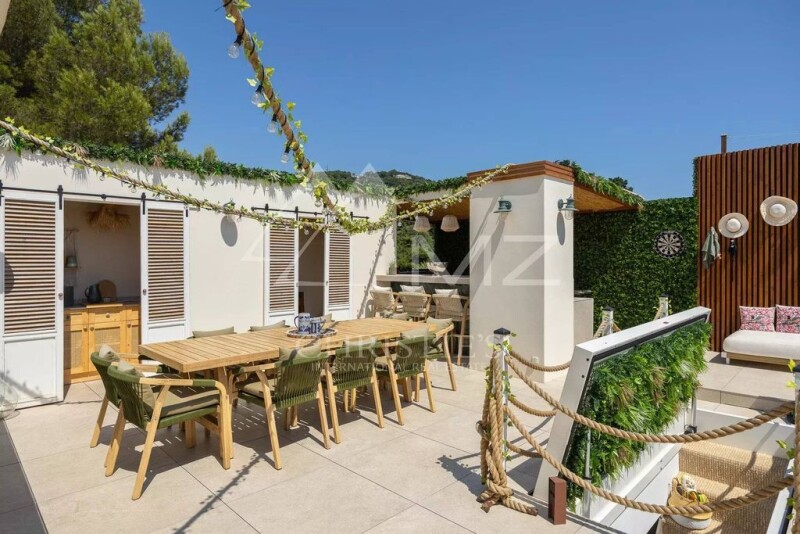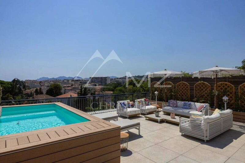 This beautiful penthouse is located in a residential area of Oxford, just a few minutes from the center of Cannes. It offers high-quality materials over an area of 110m2, including a south-facing double living room, a fully equipped modern kitchen, and a master suite opening onto a terrace shared with the double living room. The large 130m2 rooftop terrace is a true outdoor living space, featuring a kitchen equipped with professional appliances, an outdoor lounge, a pool with sunbathing area, and stunning views of Cannes and the Esterel mountains to the west. This apartment is a real gem of luxury real estate that will surely amaze you. The apartment is sold furnished. A garage and a cellar complete this property. État des risques et pollution: réalisé (null).