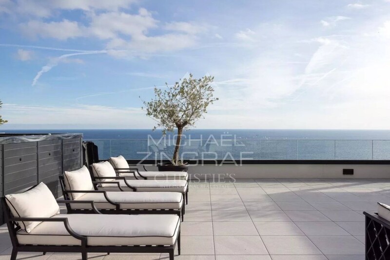 Ideally located in Roquebrune-Cap-Martin on foot from Monaco, in a new, secure residence with caretaker, boasting an infinity pool, magnificent penthouse offering panoramic views of the sea and Monaco. This sublime 209 m2 flat, with a 320 sqm roof terrace solarium, garden and very large jacuzzi, comprises a bright living room, reception room and lounge opening onto a large terrace with exceptional views of the sea and Monaco, and a fully fitted and tastefully decorated kitchen. The sleeping area comprises three bedrooms, two of which open onto the terrace, each with its own bathroom/shower. Luxuriously appointed with noble materials, this flat is equipped with reversible air conditioning, electric shutters and two garages under the grounds. You'll enjoy over 320m2 of terraces!.