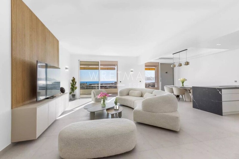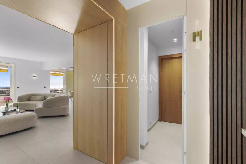 Located a stone's throw from the heart of Cannes and its beaches, this magnificent, luxuriously renovated apartment is comprised of an entrance hall with cupboards, a large living room with dining room and an open fitted kitchen opening onto a spacious terrace offering an exceptional panoramic view. on the sea and the Estérel massif. 3 beautiful bedrooms, including a master suite with a dressing room and its own terrace. 3 shower rooms, one with bathtub. Plenty of storage and laundry room. 2 cellars and a garage complete this exceptional property.
