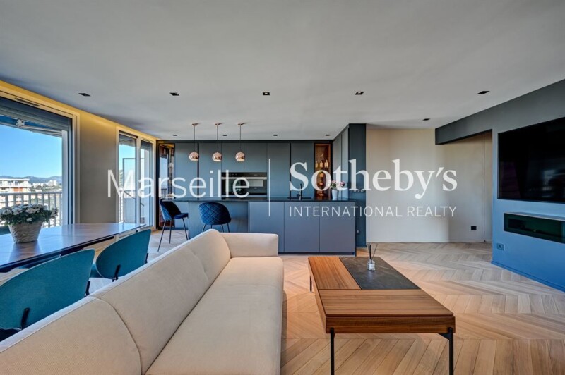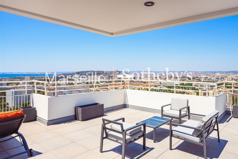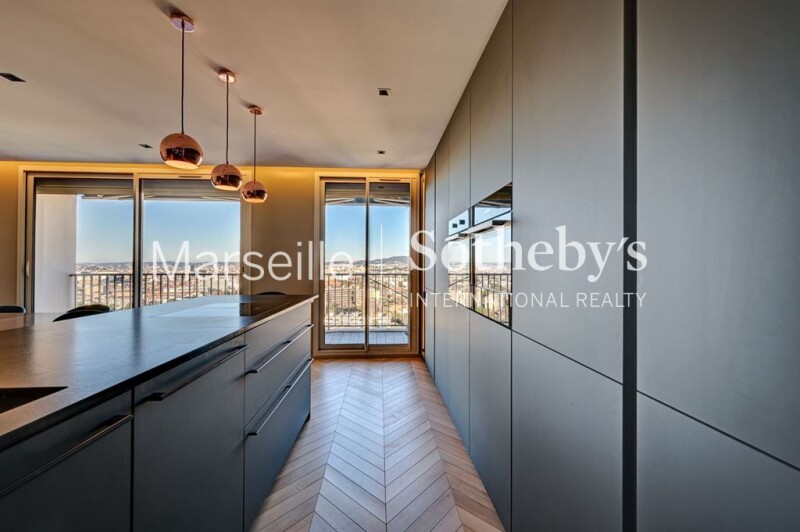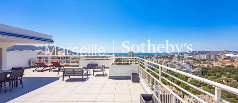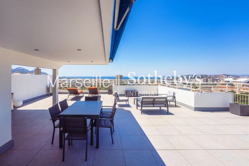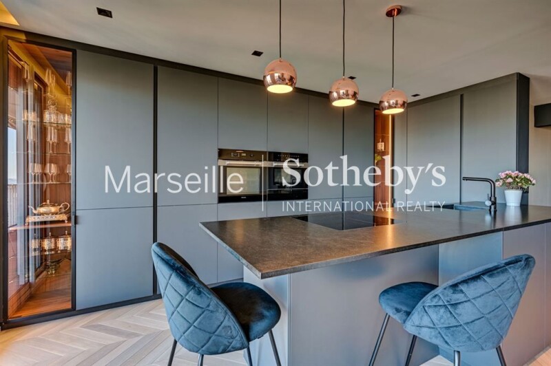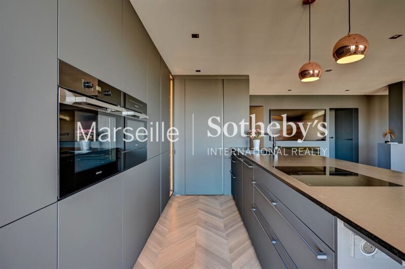 Exclusive listing - Penthouse of 110 sqm for sale on the top floor of a luxury residence in the 9th arrondissement of Marseille. This fully renovated 3-room apartment offers luxurious amenities and a panoramic view of the bay of Marseille, its sea, its mountains and its monuments. The large bay windows offer natural light throughout the day and breathtaking sunsets. The apartment is composed of an entrance, a large living room extending onto the terrace, a fully equipped kitchen with storeroom, two south-facing bedrooms with sea view, and a bathroom. Finally, the stairs will lead you to the magnificent rooftop of 100 sqm with an unparalleled view, embellished with an equipped summer kitchen. A cellar and an interior parking space complete this atypical property.
