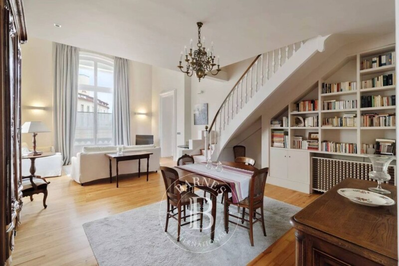 Ideally located, very close to the beach and Les Halles, in a prestigious residence, beautiful and peaceful apartment of 149.5 m² featuring a living room, a dining room, 2 bedrooms including a master suite with bathroom and dressing room, a shower room and a large mezzanine. Very high ceilings, moldings and parquet. Free parking in the residence.