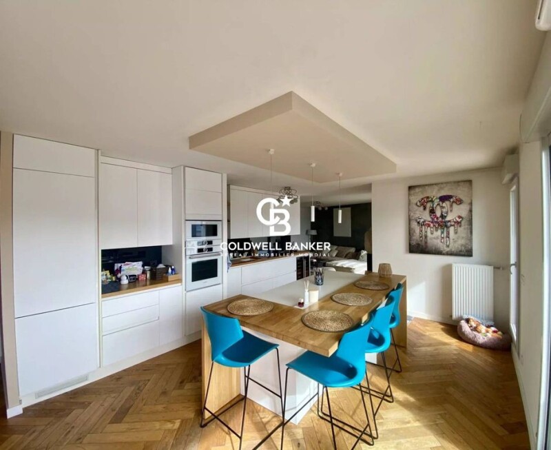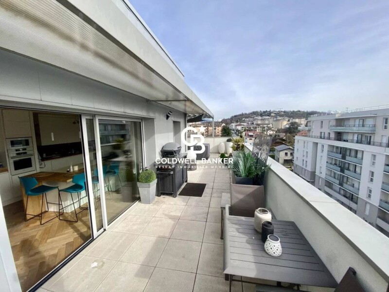 For sale in the center of Annemasse, on the top floor (attic) of a 2018 building, we present a beautiful 145 m² (1,600 sq ft) three-bedroom apartment featuring three beautiful bedrooms, one with a shower room and balcony. A spacious open-plan kitchen opens onto a magnificent terrace with views of Mont Blanc and Salève (South Exposure), a living room, a dining room, a separate bathroom, a laundry room, numerous storage cupboards, and two toilets. The property also includes a double garage in the basement. No work is required. It is located close to amenities and public transport. État des risques et pollution: en cours (null).