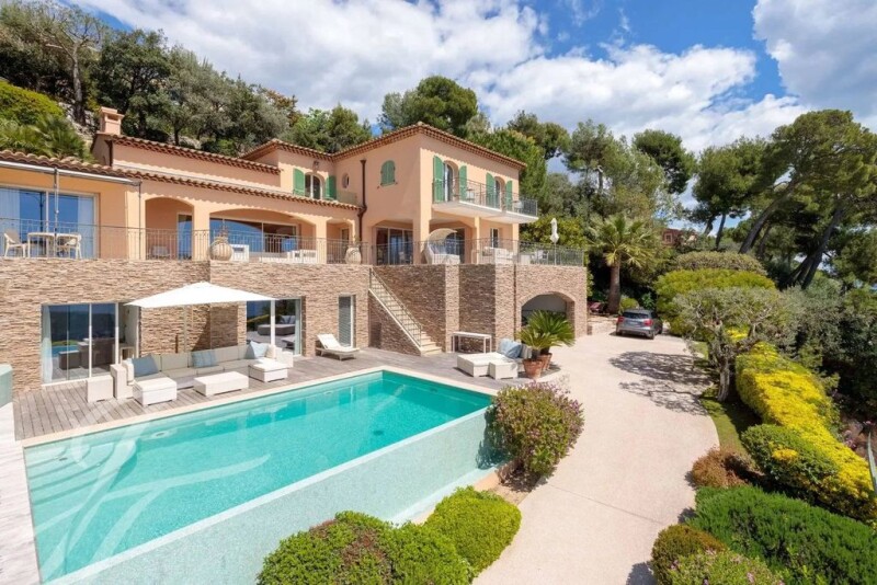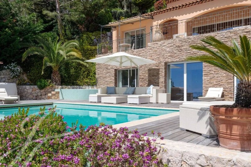 Charming villa located in a gated domain offering amazing views of the sea, the bay of Villefranche, Cap-Ferrat and Cap de Nice. The villa of mostly 400 sq.m was completely renovated in 2012. All the rooms are facing South and West. It particularly benefits from a vast cathedral living room, a dining room, 6 bedrooms and 6 bathrooms, a fitted kitchen, a fitness room, a cinema room and a musical studio soundproofed. Outside, around the infinity pool, Jacuzzi, bar and a games room. Landscaped garden of, approximately, 2000 sq.m. in terraces. The villa is secured and air conditioned. Garage for 1 or 2 cars. Numerous parking facilities. Quiet and secured area and very nice sea view.