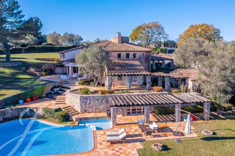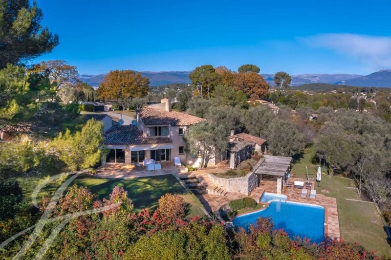 Vast property in provencal style, situated in a secure domaine with tight security and a very beautiful view of the countryside and the Mercantour mountains, close to a golf club, and to the Fontmerle pond, with access to Sophia Antipolis. This villa, in absolute tranquility, benefits from a large living room / dining room of about 90 sq.m, a separate fully equipped kitchen, 6 bedrooms, 5 bathrooms / shower rooms, a study, a games room with a bar, a laundry room and several terraces inviting a relaxing atmosphere. Built on a magnificent enclosed garden of 7,490 sq.m with a traditional swimming pool, summer kitchen, double carport and many parking spaces.