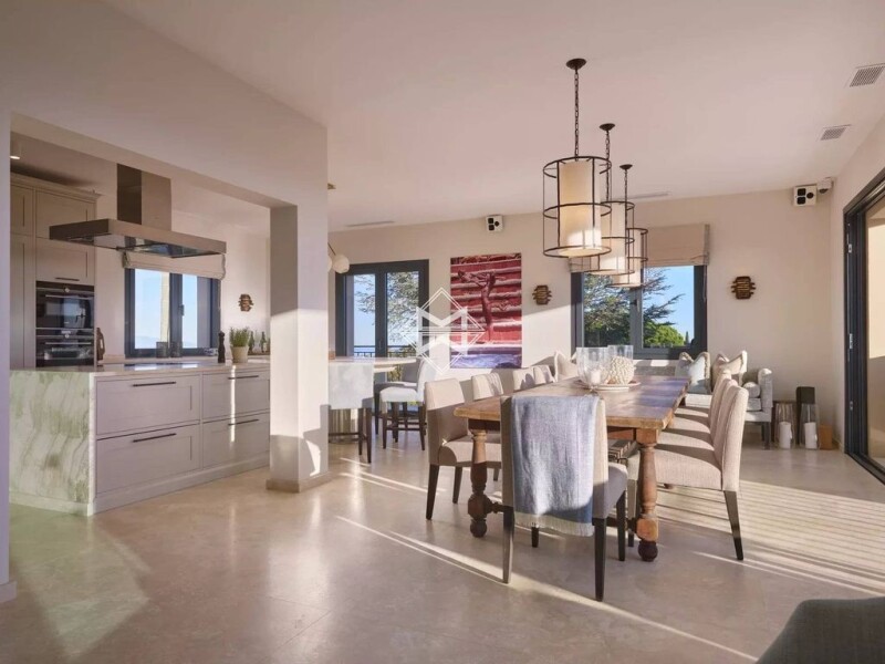 Elegant Provençale villa of over 300m² nestle on the side on the hills of Super Cannes. Facing South west it enjoys an incredible view of the sea, white topped mountains, hills of l’Esterel and the Island of Lerins in the bay of Cannes. Fully renovated in a modern but yet cosy atmosphere, it is comprised of a generous lounge with chimney and dining area leading out onto a terrace with a sea view. The large family kitchen looks toward the mountains. 5 bedrooms, office, large family room with kitchen, wine cellar built in the rocks and a large garage completes this property. For a maximum comfort it has underfloor heating and air conditioning. The garden is low maintenance with a large swimming pool and a pétanque pitch.