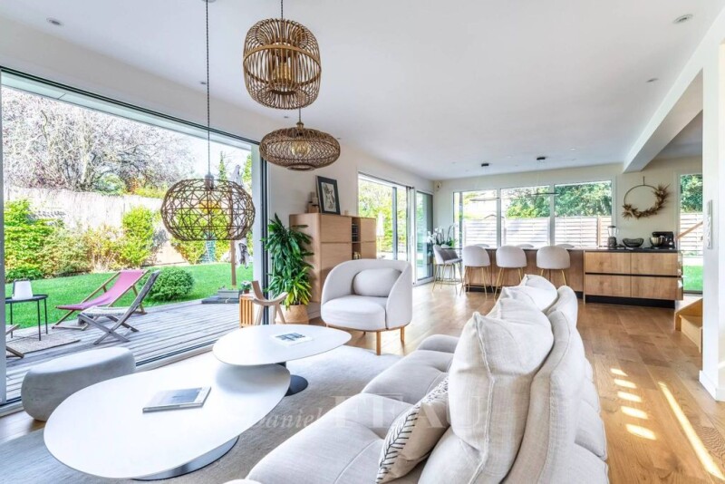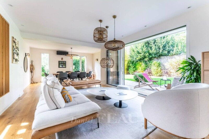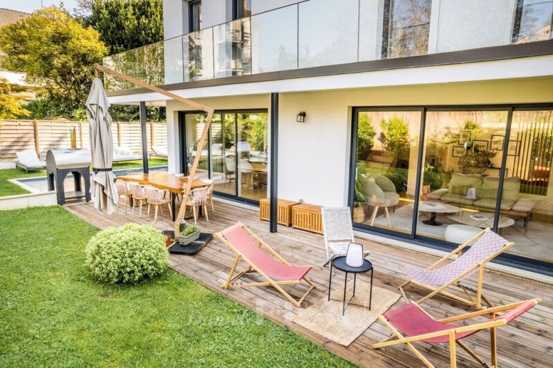 This peaceful property dating from 2021 is set in an enclosed 694 sqm plot near the shops, the schools and the station. Tastefully decorated throughout, it includes an entry with fitted storage space, a spacious living/reception room, a dining room and a kitchen with dining facilities. All open onto a terrace, the garden and a swimming pool. Upstairs are four bedrooms and two bathrooms. The top floor comprises a spacious master suite with a study area, a bespoke dressing room, and a bath/shower room. The entresol includes a recreation room/home cinema, a utility room, a wine cellar and storage space. The 25 sqm swimming pool dates from 2023. With a vegetable plot, a garden shed and parking space for three cars. État des risques et pollution: réalisé (2020-07-31).