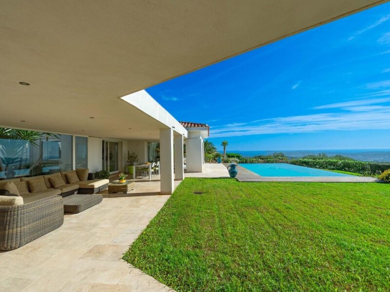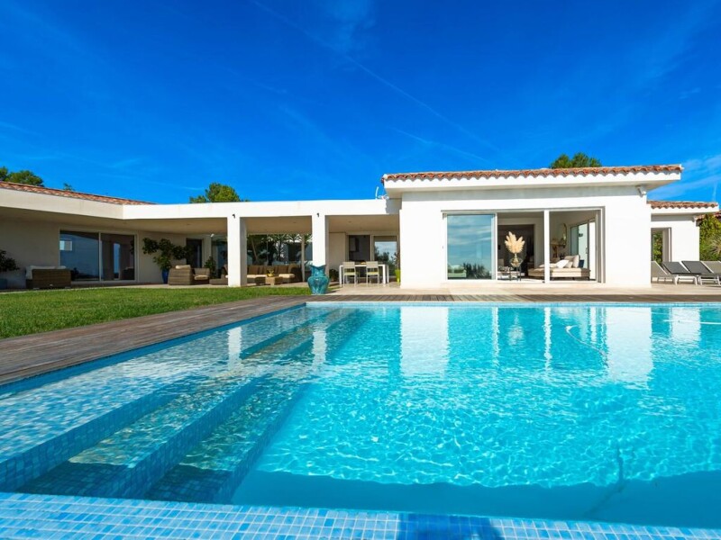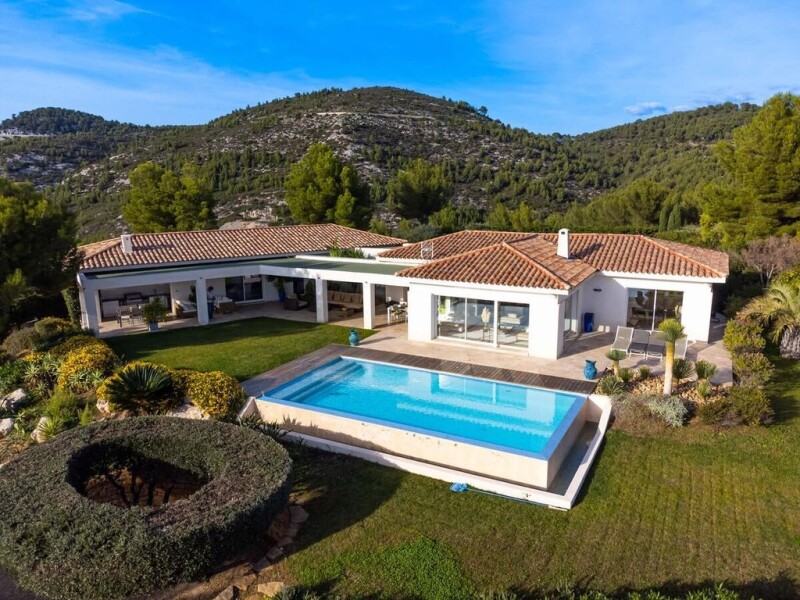 Stunning elevated views In a dominant position with 180 degree panoramic views over the hills and the sea, from La Ciotat's "Bec de l'aigle" to Toulon's harbour, a contemporary villa of approx. 330m2 on one level, perfectly laid out for optimal living. Built on a flat landscaped plot of approx. 4000 m2, adorned with an infinity mirror pool, a petanque area and a large terrace with summer kitchen. the ideal location to enjoy time with friends and family. As soon as you enter through the electric gates, it's a sight to behold, with the cirque of hills enveloping the site. Behind the house there is plenty of space for parking and entertaining guests. 2 garages and a carport. As soon as you enter the house, the views are breathtaking and the windows draw you towards the pool and outdoor living. Here you can live entirely on one level and relax on a sun lounger every day. The unobstructed views of the sea and hills are everywhere and a delight for the senses. Well appointed, accommodation includes on the ground floor, a lounge-dining room with picture bay windows, a separate kitchen, 3 suites including the master. In between: 1 studio, kitchen, shower room, gym, home cinema, study, wine cellar, laundry room. The property is connected to water from the Canal de Provence. This offer is rare because it combines features that are rarely found together: A functional single-storey villa for comfortable, easy living on a dominant, flat plot with sublime views.
